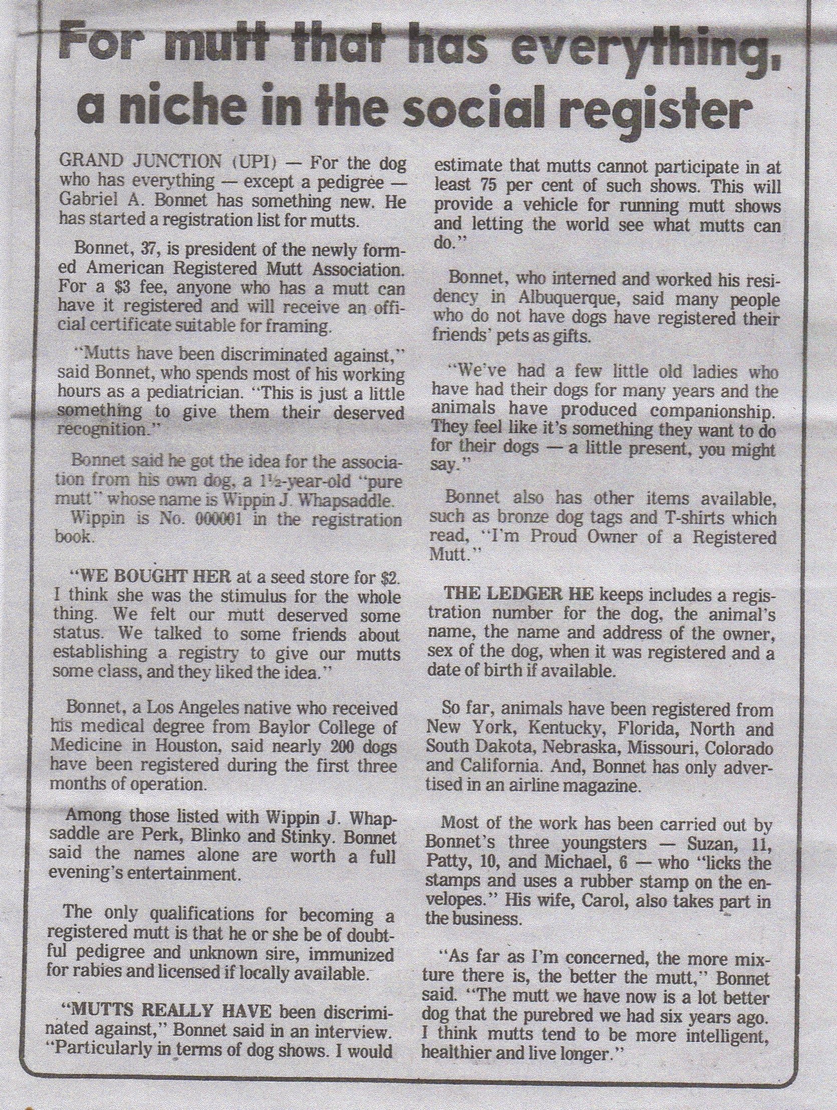Our tale begins in 1977, when Gabriel Bonnet founded the American Registered Mutt Association (ARMA) as a social registry for Mutts, formed out of a love and respect for canines of questionable heritage.